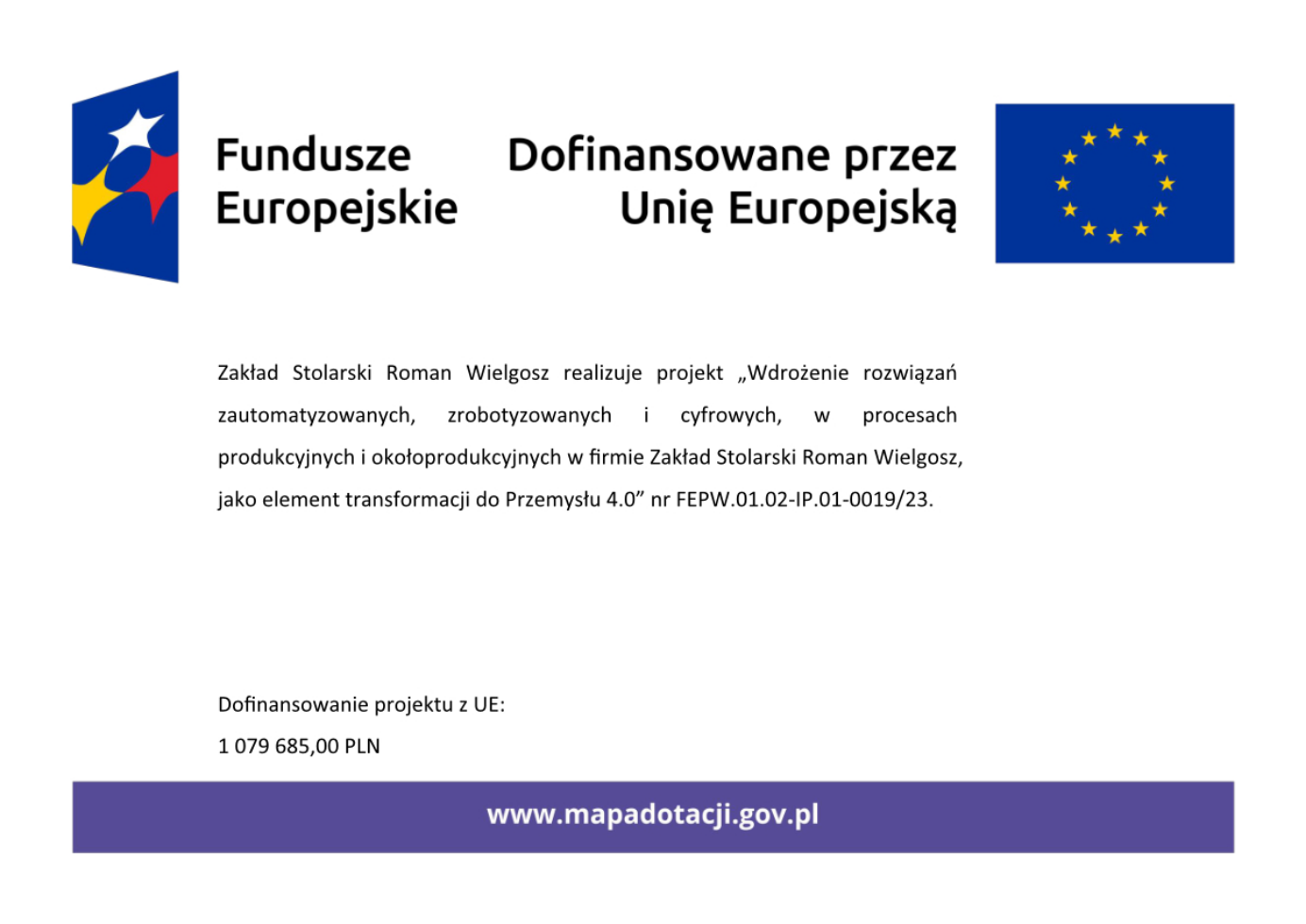 Celem projektu jest wzmocnienie trwałego wzrostu i konkurencyjności przedsiębiorstwa z sektora MŚP: „ZAKŁAD STOLARSKI Roman Wielgosz” poprzez inwestycje produkcyjne. Cel ten zostanie osiągnięty poprzez wsparcie przeznaczone na przeprowadzenie procesu transformacji przedsiębiorstwa w kierunku Przemysłu 4.0. Wsparcie będzie obejmowało realizację planu inwestycyjnego przedsiębiorstwa na rzecz automatyzacji i robotyzacji procesów obejmujące przeprowadzenie audytu technologicznego/diagnozy dojrzałości cyfrowej przedsiębiorstwa oraz wdrożenie działań wynikających z opracowanej mapy drogowej w przedsiębiorstwie, w szczególności: zakup automatów, robotów oraz innych maszyn i urządzeń, a także oprogramowania oraz usług doradczych i szkoleniowych niezbędnych do instalacji i obsługi ww. urządzeń.